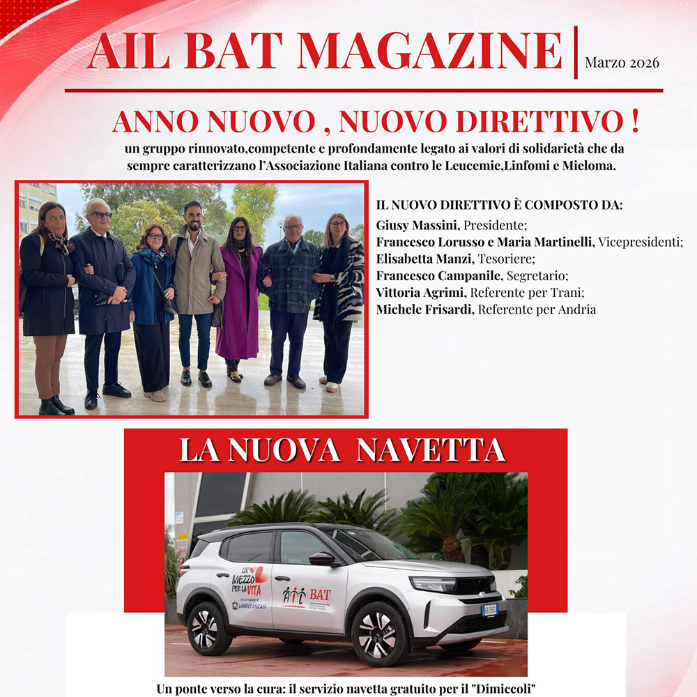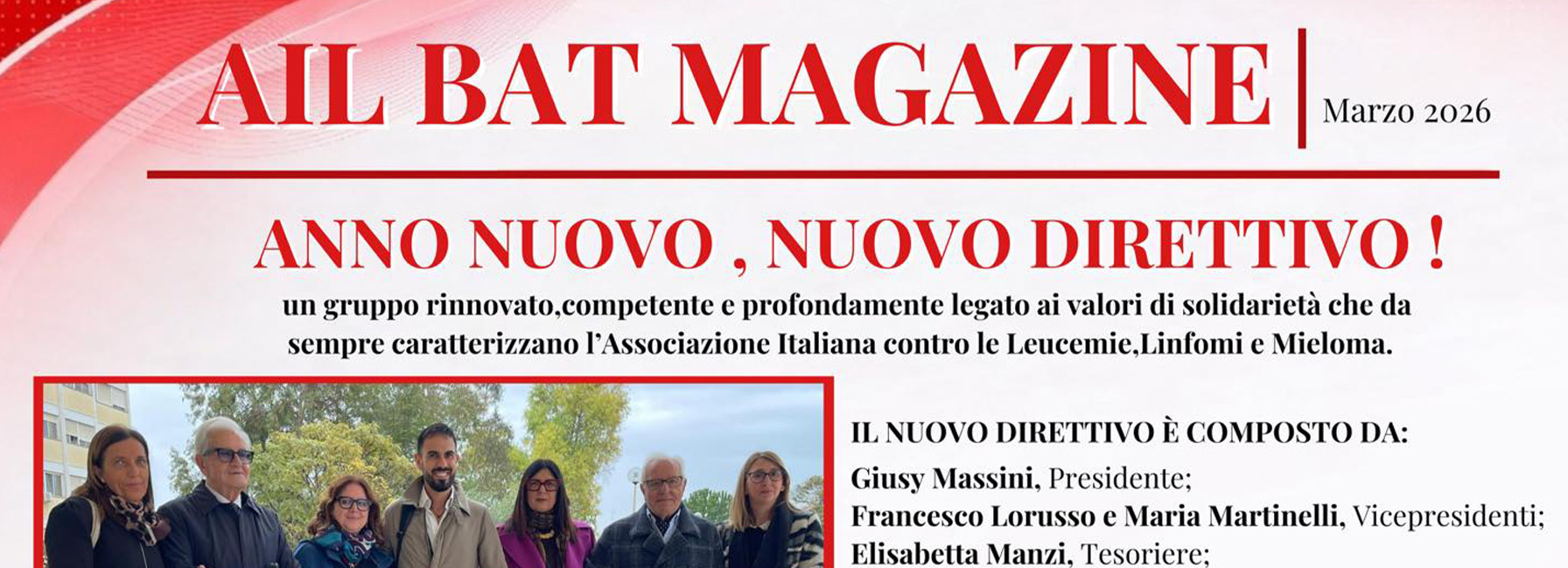 L’AIL BAT nasce il 24 ottobre 2012 in sintonia con gli scopi ed il programma dell’A.I.L. Nazionale a sostegno ed appoggio del reparto di Ematologia di riferimento della A.S.L. BAT.