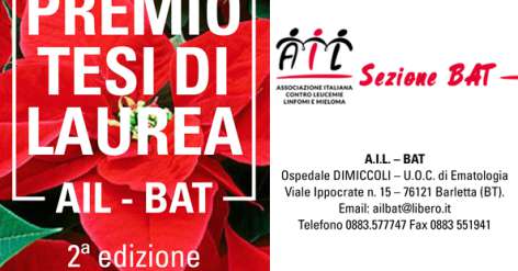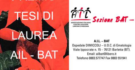 PREMIO “AIL BAT” PER TESI DI SPECIALIZZAZIONE IN EMATOLOGIA Bando di Concorso Seconda Edizione – SCARICA IL BANDO CONCORSO 2020 – PDF – VISUALIZZA LA LOCANDINA