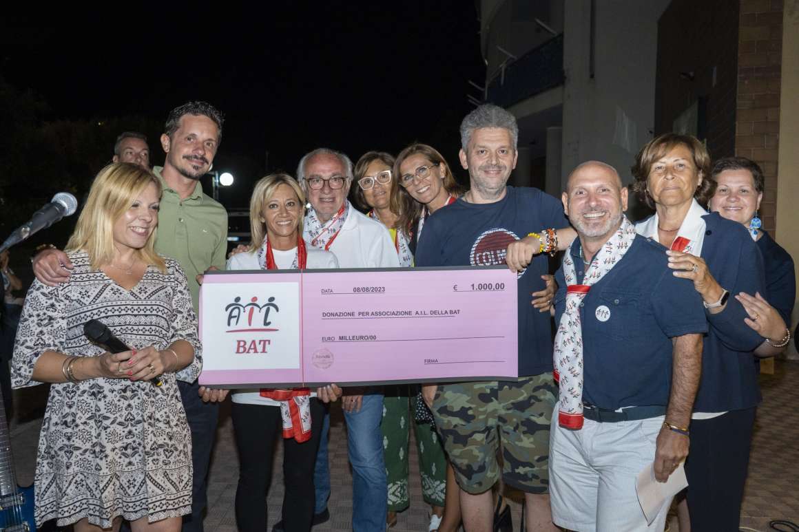 Generosità e solidarietà non vanno in vacanza. La manifestazione “Cuori a Levante” patrocinata del Comune e dalla Confcommercio di Bisceglie tenutasi in Bisceglie martedì 1° agosto presso il Rondò Caffè – Bisceglie e grazie all’impegno profuso da Rino e i suoi collaboratori ha dato i suoi frutti: una parte dell’incasso è stato devoluto all’organizzazione di volontariato A.I.L. Bat per la ricerca e a sostegno dei pazienti del reparto di ematologia dell’Ospedale di Barletta. Un grazie a tutti.