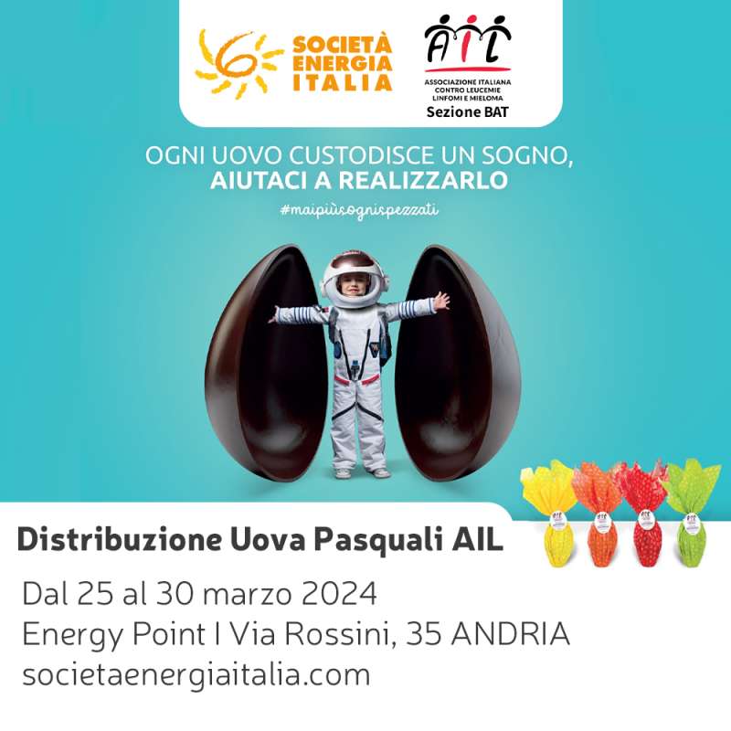 Per continuare a far crescere la Ricerca AIL ha bisogno del nostro aiuto! dal 25 al 30 marzo 2024 nel nostro Energy Point in Via Rossini, 35 ad Andria sarà possibile continuare ad acquistare le Uova Pasquali AIL.