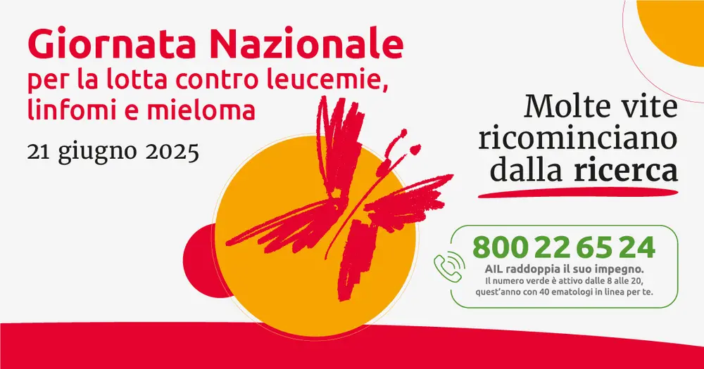 Il 21 giugno, al solstizio d’estate, AIL celebra la Giornata Nazionale per la lotta contro le Leucemie, i Linfomi e il Mieloma. Un’occasione per raccontare i progressi della ricerca in ematologia e per lanciare un messaggio importante a tutti i pazienti e i loro familiari: non siete soli nella vostra battaglia. Questa giornata sarà anche l’occasione per raccontare l’impegno delle 83 sezioni AIL a favore dei pazienti e delle loro famiglie, un supporto che non si è mai fermato dal 1969 ad oggi.