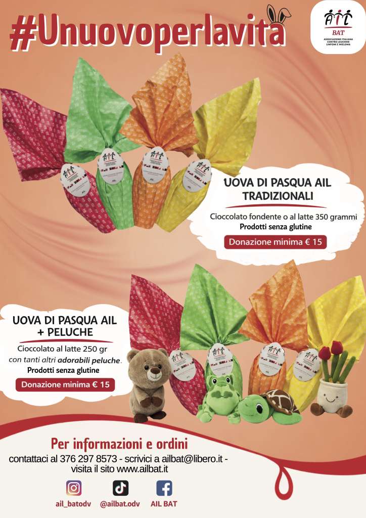 Con l’arrivo della Pasqua, si rinnova l’appuntamento con la solidarietà promosso dall’AIL BAT (Associazione Italiana contro Leucemie, Linfomi e Mieloma – Sezione Barletta-Andria-Trani). Sotto lo slogan #Unuovoperlavita, l’iniziativa invita i cittadini a sostenere la ricerca scientifica e l’assistenza ai pazienti ematologici attraverso un gesto dolce e significativo.