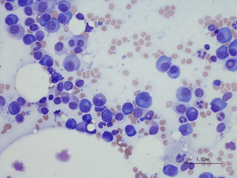 Nel mieloma, alcune plasmacellule subiscono una trasformazione, si moltiplicano in modo incontrollato nel midollo osseo e producono in gran quantità un anticorpo alterato (chiamato proteina monoclonale o “M”), il cui accumulo può indebolire le ossa, causare anemia, problemi ai reni e aumentare il rischio di infezioni.