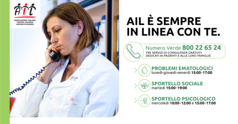 AIL È SEMPRE IN LINEA CON TE. Il numero verde AIL è sospeso per le festività dal 27 dicembre fino al 7 gennaio. Riprenderà regolarmente a partire da lunedì 8 gennaio 2024. Il servizio Numero Verde AIL 800 22 65 24 è attivo dal lunedì al venerdì e in linea si alternano un ematologo, uno psicologo e un esperto di […]