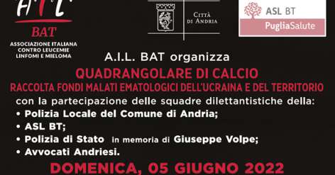 QUADRANGOLARE DI CALCIO DOMENICA 05 giugno 2022 c/o stadio “DEGLI ULIVI” ANDRIA – ore 17,30 organizzato dall’A.I.L. BAT con il patrocinio Comune di Andria e A.S.L. BAT PER RACCOLTA FONDI A FAVORE DI PAZIENTI EMATOLOGICI: – DELL’UCRAINA, profughi in cura presso REPARTI di EMATOLOGIA in ITALIA; – DEL TERRITORIO in cura presso la “U.O.C. DI […]