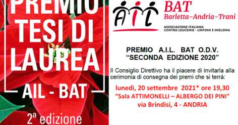 Gentilissimi Sostenitori, in allegato vi inviamo l’invito per la cerimonia di consegna del “PREMIO A.I.L BAT 2020” II° Edizione in programma lunedì 20 settembre 2021 alle ore 19,30 presso la “Sala Attimonelli – Albergo dei Pini” – Via Brindisi, 4 – Andria. Si evidenzia che il Premio destinato alla FONDAZIONE GIMEMA, per la Sezione Ematologia […]